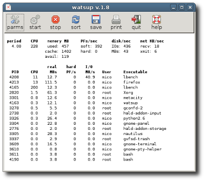 Watsup è una semplice applicazione per monitorare le risorse di sistema.Ecco le caratteristiche dell’applicazione tratte dal sito del produttore: * Overhead is low, supporting a sample interval down to 0.1 seconds * Overall system and top process resources are shown on one page * CPU, memory, disk I/O, network I/O, and page faults are monitored * Usage for N CPUs shown on a scale from zero to N x 100% * The highest ranked processes fitting in the window are shown, with minimal jumping around between samples (easy to watch one or a few processes) * Process rank is a weighted sum of CPU, hard page faults, and disk I/O over the last few samples (the weight of each sample declines over time) * Filter processes by user, PID, executable * Font can be made large or small (for display in monitor corner) * Click on a process to kill the process (after confirmation)Per installarlo su K|X|Ubuntu basta scaricare il file .deb dal link posto sotto cliccarci sopra e confermare oppure aprire il terminale recarsi dentro la cartella e scriveresudo dpkg -i *.debconfermiamo e alla fine avremo il nostro Watsup installato.Per maggiori informazioni consiglio di consultare il sito del produttore accessibile direttamente dal link posto qui sotto.homedownload watsup-1.8-32.debdownload watsup-1.8-64.debdownload watsup-1.8-32.rpmdownload watsup-1.8-64.rpmdownload watsup-1.8.tar.gz
