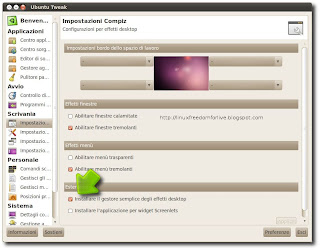Se vogliamo invece installare Compiz in maniera molto più facile ed inoltre avere anche la possibilità di configurare al meglio la nostra Distribuzione consiglio di installare Ubuntu Tweak (Per installarlo basta segiore QUESTO post).