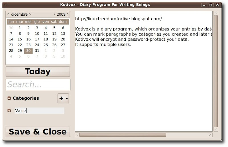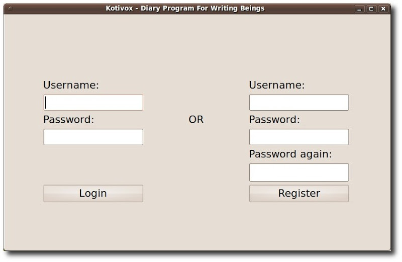 Kotivox è un’applicazione che crea un nostro diario personale, organizza le voci in base alla data. È possibile marcare punti per categorie, per favorire la ricerca all’interno di tali categorie. Kotivox cripta i nostri dati ed inoltre utilizza l’accesso con login e password (nella foto sotto possiamo vedere la finestra all’avvio dell’applicazione).