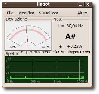 Per poterlo utilizzare bisogna avere qualsiasi tipo di microfono collegato al nostro pc e avviare Lingot, avviciniamo il nostro strumento al microfono e suonare una nota. Per una buona accordatura la lancetta si deve trovare dentro la zona verde al centro.