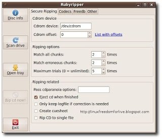 Rubyripper è senza dubbio una delle migliori e più completa applicazione per estrarre le tracce audio dai CD Rom per LinuX.L’estrazione accurata interessa sicuramente chi vuol masterizzare una copia di backup “perfetta” anche in condizioni difficili (CD non più nuovissimi, dalla superficie non più perfetta, eccetera) o chiunque desideri poi proseguire il lavoro producendo file compressi (lossy o meglio ancora lossless)(ovvero con o senza perdita di qualità durante la compressione). Rubyripper offre un supporto dei codec FLAC, lame, vorbis e wav, creazione di liste *.m3u e inoltre la compatibilità col database freedb.org per la ricezione di informazioni sul disco.