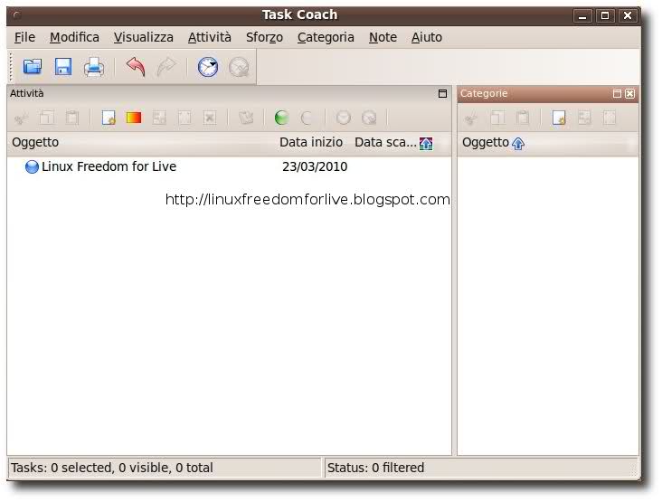 Task Coach un ottimo software per il nostro manager personale. Con Task Coach potrete creare, modificare, eliminare i vostri impegni e sotto-impegni. Potrete specificare il soggetto, la descrizione, la priorità, la data di inizio e quella di scadenza, e, in più, potete aggiungere un ulteriore promemoria. Potete poi visualizzare i vostri impegni sotto forma di lista o in forma di albero. Potete ordinarli in base al soggetto, al bilancio, alla data di scadenza, etc. etc. Task Coach è anche dotato di comodi filtri che vi permettono di visualizzare solo quello che volete (le sole attività in scadenza ad esempio). Potete inoltre aggiungere ai vostri impegni degli allegati mediante un semplice drag&drop. Il formato dei file creati in Task Coach è l?XML, ma potrete esportare i vostri impegni in formato HTML o CSV. Alla lingua italiana si aggiunge la già enorme intuitività del software, resa possibile anche grazie alla presenza di icone belle e molto accattivanti.