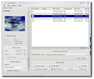 Converseen è un’applicazione (scritta in C con le librerie Qt4) per convertire più immagini in più di 100 formati più popolari come: DPX, EXR, GIF, JPEG JPEG-2000, PDF, PhotoCD, PNG, Postscript, SVG, e TIFF. Con Converseen è possibile convertire migliaia di immagini in poco tempo, grazie ad un’interfaccia semplice e ben strutturata. Consente inoltre la possibilità di aggiungere intere cartelle o anche la singola immagine il tutto semplicemente con pochi click del nostro mouse.