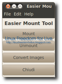 Easier Mount Tool è una semplice applicazione, scritta in Python e PyGTK, che permette di montare i nostri File Immagine nella nostra Distribuzione. Inoltre l’applicazione permette di convertire File Immagine bin, cdi, daa, gbi, mdf, nrg, uif in formato Iso.
