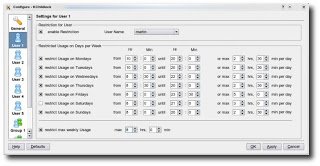 KChildlock è una semplice applicazione, specifica per kde, che controlla e limita il tempo trascorso sul computer di un bambino. I limiti possono essere specificati per ogni giorno della settimana, dalle ore inferiore e superiore, e il massimo tempo di utilizzo giornaliero.