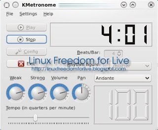 emette un suono (un semplice battito) con una frequenza prestabilita, aiutando il musicista ad eseguire un brano o un esercizio col giusto ritmo. Grazie a KMetronome possiamo decidere se far battere ogni quarto, ogni ottavo, ogni tre ottavi, ogni sedicesimo o tutti questi valori insieme. Si può impostare i tempi del brano: 2/4, 3/4, 4/4 e così via fino a 9/4, inoltre possiamo attivare una “scampanellata” alla prima nota di ogni battuta.