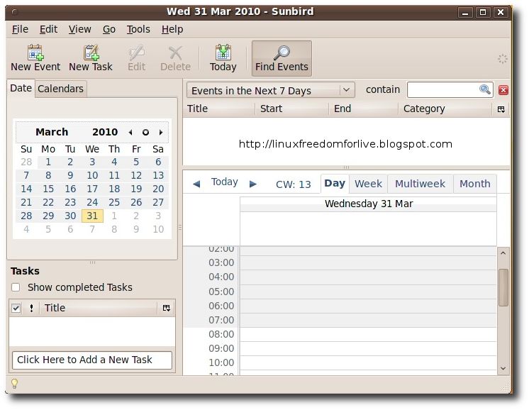 Mozilla Sunbird è un’applicazione per la gestione di calendari, agenda, memo, contatti, gestione riunioni, sviluppata da Mozilla Foundation e da una vasta comunità di contributori esterni. È espandibile con componenti aggiuntivi (estensioni e temi).Inoltre è possibile importare o pubblicare calendari all’interno di una rete locale o su internet: si potranno così gestire eventi, appuntamenti e attività da remoto e in maniera partecipativa con altri utenti.