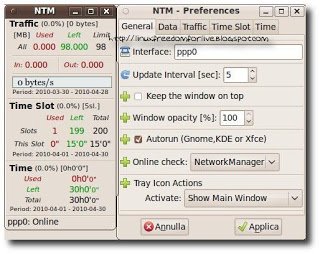 NTM è un monitor di rete e del traffico internet per Linux. Consigliato per chi utilizza connessioni a tempo o a traffico grazie a NTM una volta raggiunta la soglia da noi precedentemente impostata la connessione si disconette automaticamente.