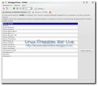 qviaggiatreno è una semplice applicazione per controllare la partenza e arrivi ( e purtroppo ritardi) dei treni in tutta Italia. L’applicazione si interfaccia a ViaggiaTreno con il vantaggio (oltre a quello di non utilizzare alcun browser) di poter controllare più treni contemporaneamente e scegliere l’intervallo di aggiornamento. Per poter utilizzare l’applicazione è semplicissimo dopo averlo installato andiamo su Applicazioni -> Internet -> qviaggiatreno. Scegliamo la stazione cliccando su Viaggiatreno -> Stazione e inseriamo la stazione da monitorare (esempio Verona) ci appariranno tutte le stazioni di Verona e scegliamo quella preferita ed ecco tutti i treni in arrivo e partenza. Inoltre possiamo effettuare ricerche mirate su singolo treno e inserirci l’intervallo d’aggiornamento.