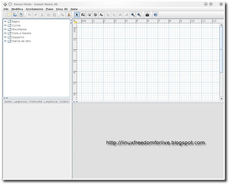 Sweet Home 3D è un’ottima applicazione open source disponibile per Linux sviluppata in Java e per questo disponibile anche in versione online. Permette di progettare una abitazione definendo i muri perimetrali e la posizione di porte e finestre tramite un semplicissimo editor grafico. E’ inoltre possibile arredare l’abitazione tramite un set di mobili (letti, armadi, tavoli, sedie, divani…) e oggetti tipici di una abitazione (televisori, piante, pianoforti…).
