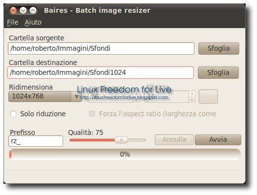 Baires è una piccola applicazione che permette di ridimensionare in pochi clic le nostre immagini. L’utilizzo è semplicissimo, una volta installata l’applicazione avviamola e per prima cosa andiamo in File -> Preference e selezioniamo la lingua dell’applicazione (nel nostro caso Italiano) e i formati delle nostre immagini e clicchiamo su “OK” per confermare. In cartella sorgente selezioniamo la cartella contenente le foto da convertire e in cartella destinazione la cartella dove verranno salvate le nostre foto. Selezioniamo la risoluzione e la qualità e il Prefisso e clicchiamo su Avvia. Al termine avremo le nostre foto correttamente ridimensionate.
