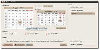 Date Calculator è un semplice calcolatore di date. Il suo scopo è di rendere facile calcolare quanti giorni ci sono tra due date, o per aggiungere o sottrarre un certo numero di giorni da una determinata data. Questa applicazione può essere utile per avvocati, commercialisti o altri professionisti.Nell’esempio della foto (il classico esempio) quanti giorni mancano a Natale  ad oggi  20 maggio mancano 220 Giorni. Utilizzare l’applicazione è semplicissimo, una volta avviata, vasta inserire le 2 date e cliccare su Get Internal sotto troveremo il risultato. Inoltre possiamo inserire come date variabili anche esempio il 3 giovedì del mese marzo 2008  con il 2 martedì di Novembre 2015, ed inoltre permette perfino l’inserimento di fasi lunari come data.