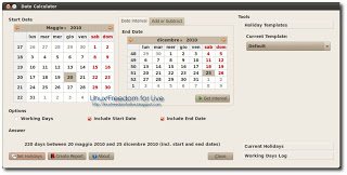 Date Calculator è un semplice calcolatore di date. Il suo scopo è di rendere facile calcolare quanti giorni ci sono tra due date, o per aggiungere o sottrarre un certo numero di giorni da una determinata data. Questa applicazione può essere utile per avvocati, commercialisti o altri professionisti.Nell’esempio della foto (il classico esempio) quanti giorni mancano a Natale ad oggi 20 maggio mancano 220 Giorni. Utilizzare l’applicazione è semplicissimo, una volta avviata, vasta inserire le 2 date e cliccare su Get Internal sotto troveremo il risultato. Inoltre possiamo inserire come date variabili anche esempio il 3 giovedì del mese marzo 2008 con il 2 martedì di Novembre 2015, ed inoltre permette perfino l’inserimento di fasi lunari come data.
