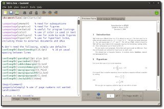 Gummi è un semplice editor LaTeX scritto in GTK, simile a DeSiGLE, grazie al quale avremo un semplice editor di testo che riconosce la sintassi del linguaggio LaTeX ed inoltre una finestra dove visualizzare l’anteprima PDF di ciò che stiamo scrivendo. L’anteprima del PDF verrà effettuata in automatico ed ad ogni cambiamento che effettuamo al codice verrà visualizzata immediatamente.