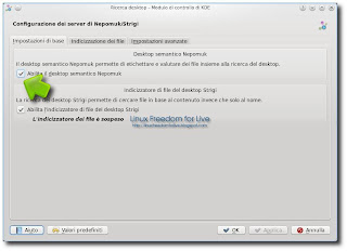 Unico inconveniente è che la nostra Distribuzione ha un notevole rallentamento soprattutto se abbiamo un pc non di nuova Generazione. Ecco come fare a disabilitare Nepomuk/Strigi. Andiamo in Menu -> Impostazioni -> Impostazioni di Sistema -> Avanzate -> Ricerca Desktop