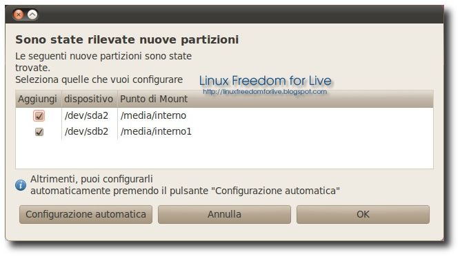 Si aprirà una Finestra selezioniamo le partizioni che vogliamo si montino in automatico all’avvio, in alternativa se vogliamo che si montino tutte clicchiamo su Configurazione Automatica, al termine clicchiamo su Ok e (se non si chiude da sola) chiudiamo la finestra.