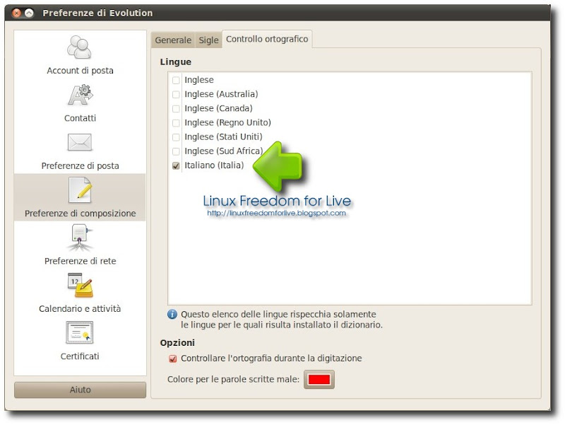 Per impostare la lingua italiana nel nostro Evolution basta andare su Modifica -> Preferenze -> Preferenze di Composizione e andiamo nel tab Controllo Ortografico e scegliamo italiano e togliamo tutte le altre lingue. Ora avremo il nostro Controllo Ortografico in Italiano