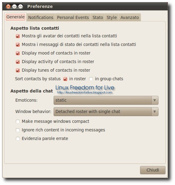 * Emoticons, Avatars, Trasferimento di files, URL grabber, Bookmarks