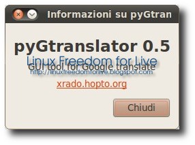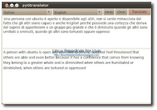 pyGtranslator è una semplice applicazione che offre la possibilità di accedere all’efficiente servizio di traduzione fornito da Google direttamente dal proprio desktop, senza dover aprire il browser di internet. Dotato di un’interfaccia grafica che permette di sfruttare velocemente la potenza del motore di traduzione di Google. Impiega poche risorse di sistema e può essere usato in modo pratico con altre applicazioni senza ridurne le prestazioni. Molto utile per gli utenti che generalmente leggono documenti in altre lingue o interagiscono con persone sparse in tutto il mondo.