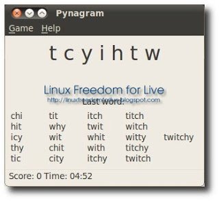 Pynagram è un semplice gioco, scritto in Python, in cui al giocatore ha a disposizione sette lettere in un ordine casuale da anagrammare. Ad ogni parola che viene costruita dalle lettere confuse il giocatire guadagna dei punti. Attenzione il gioco viene fornito in lingua inglese.