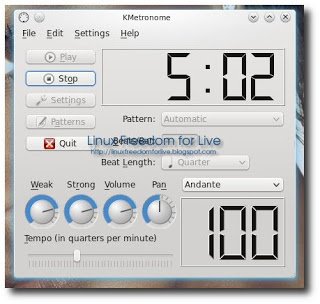 KMetronome è un metronomo MIDI, specifico per KDE, basato su ALSA sequencer. L’applicazione emette un suono (un semplice battito) con una frequenza prestabilita, aiutando il musicista ad eseguire un brano o un esercizio col giusto ritmo. Grazie a KMetronome possiamo decidere se far battere ogni quarto, ogni ottavo, ogni tre ottavi, ogni sedicesimo o tutti questi valori insieme. Si può impostare i tempi del brano: 2/4, 3/4, 4/4 e così via fino a 9/4, inoltre possiamo attivare una “scampanellata” alla prima nota di ogni battuta.