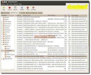 Streamtuner2 è un’applicazione che permette esclusivamente di ascoltare la radio in streaming ed è anche possibile registrarla tramite streamripper. Una volta avviato ci permetterà’ di scartabellare tra le varie “radiodirectory” dei canali come SHOUTcast, Live365, Xiph.org, googlestation, punkcast.com. L’interfaccia in GTK e’ molto semplice, attraverso dei tab si seleziona una radiodirectory a scelta, questa a sua volta contiene cartelle che suddividono la musica in vari generi, una volta scelto il genere a noi piu’ congeniale sul frame principale comparirà’ una lista delle radio inerenti, doppio clik su quella scelta ed ecco che streamtuner sintonizza il nostro player sul canale giusto(in verita’ di default streamplayer fa riferimento ad audaucious, ma attraverso il menu’ di configurazione e’ molto semplice cambiarlo col nostro preferito)