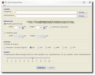 Easy Image Boss è una semplice applicazione, scritta in Java, per convertire/modificare grandi quantità di immagini con pochi click del mouse. Con Easy Image Boss possiamo sia ridimensionare le nostre immagini che cambiarne di estensione (JPG, GIF, PNG, BMP, ICO, TIFF), inoltre possiamo modificare la compressione delle immagini in formato Jpeg. Il tutto semplicemente scegliendo o la cartella dove abbiamo i file e la cartella dove verranno salvati i file convertiti, selezioniamo sia la risoluzione che l’estensione e cliccando su Elabora.