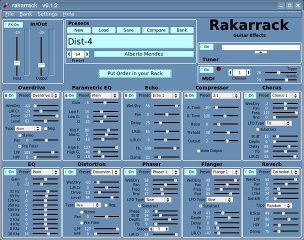 Rakarrack e’ un processore effetti per chitarra per GNU / Linux semplice e facile da usare ma che contiene caratteristiche che lo rendono unico in questo campo di applicazioni. Esso contiene 17 effetti: Equalizzatore lineare, Equalizzatore parametrico, compressore, Distorsion, Overdrive, Echo, Chorus, Phaser, Flanger riverbero, WAHWAH, Alienwah, Harmonizer, NoiseGate, Delay, cabinet, Autopan / Extra Stereo. Integra un sintonizzatore e un convertitore MIDI. Puo’ anche essere gestito da un controller MIDI esterno. Le impostazioni utente possono essere immagazzinate in preset e possono essere utilizzati per creare banche di effetti.