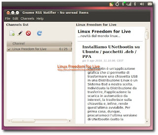 Semplicissimo da utilizzare, una volta installato avviamolo andando su Applicazioni -> Internet -> Gnome RSS Notifier, troveremo un nuovo applet clicchiamoci sopra e si aprirà una finestra. Aggiungiamo i nostri feed andando su Channels -> Nuovo e inseriamo l’Url e il titolo da dare al Feed. Per aggiungere altri basta ripetere l’operazione. Ora andiamo in Edit -> Preferenze e impostiamo il tempo di aggiornamento (di default 15 minuti). Ora saremo avvisati quando nuovi articoli vengono pubblicati ed inoltre potremo visualizzarli cliccandoci sopra l’applet.
