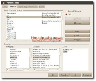 Apriamo innanzitutto Strumenti / Personalizza / Tastiera. Controlliamo poi che sulla destra sia selezionato il pulsante di scelta Calc (e non OpenOffice.org). Selezioniamo nel riquadro Area la voce Modifica e nel riquadro Funzione la voce Cancella contenuti (e non Elimina contenuti), poi cerchiamo in alto il comando Cancella e premete Cambia.