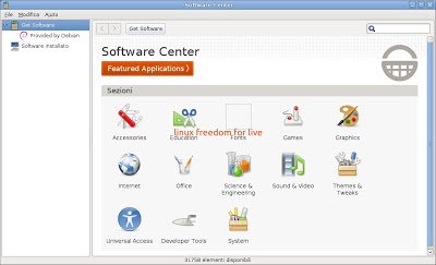 Già presente su Ubuntu,anche in Debian 6.0 Squeeze avremo di defalut Software Center una semplice applicazione che permette di sfogliare ed installare migliaia di applicazioni libere. Si possono vedere le applicazioni disponibili in base alla loro categoria o fare velocemente ricerche in base al nome o alla descrizione. È anche possibile esaminare le applicazioni già installate e rimuovere quelle di cui non si ha più bisogno.