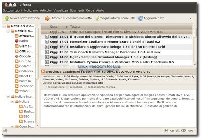 Linux Feed Reader, meglio conosciuto come Liferea, è un lettore di feed RSS sviluppato per il desktop enviroment Gnome. Liferea è in grado di leggere feed in diversi formati, tra cui ricordiamo RDF/RSS, CDF, Atom/Echo/PIE 0.2, OPML 1.0 e OCS 0.4. L’interfaccia è molto pulita ed intuitiva e ci consente di configurare fin nel minimo dettaglio il nostro lettore. Possiamo ad esempio impostare la frequenza di aggiornamento, la modalità di caching dei feed, la configurazione della modalità di navigazione tra i feed, l’interfacciamento con i browser esterni, l’impostazione di eventuali proxy e la possibilità di visualizzare un’icona di notifica nella systray.