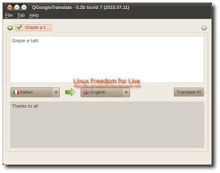 Una volta lanciato QGoogleTranslate (Applicazioni -> Internet -> QGoogleTranslate), anche se chiudiamo l’applicazione rimane attivo rivelando la sua presenza di una piccola icona nella nostra area di notifica, pronto ad essere aperto in qualsiasi momento con un click. E’ sufficiente copiare del testo e premere Translate It! Ve vogliamo invertire le lingue basta dare un click sulla freccia verde