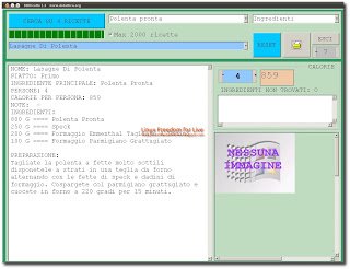 Segnalatomi da Michele da Teramo ecco un semplice programmino, specifico per Windows, ma grazie a Wine anche nel nostro Ubuntu / Linux con il quale avremo un database di oltre 26800 Ricette comprendete le funzioni di ricerca e calcolo delle calorie (42186 ingredienti definiti). Possibilità di aggiungere immagini dei piatti e di inserire proprie ricette (con l’utility dbrice13agg.exe).