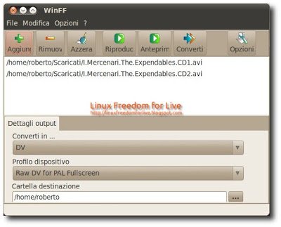 Una volta installato avviamo WinFF da Applicazioni -> Audio e Video -> WinFF, clicchiamo su Add per aggiungere i video da convertire, scegliere il formato di destinazione tramite il comodo menu a tendina che si trova nella parte bassa della finestra e cliccare infine sul pulsante Convert per avviare l’operazione.