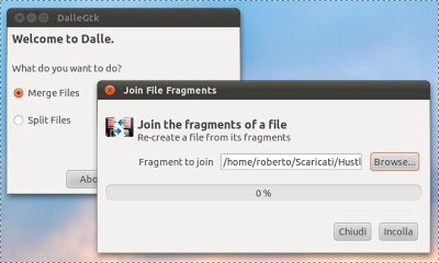 Dalle è una semplice applicazione con la quale possiamo dividere in file più piccoli un file più grande e permette di ricomporre il tutto. Una volta installata basta andare in Applicazioni -> Accessori -> Dalle e scegliere “Marge Files” per unire i nostri file split, o “Split Files” per dividere un file in più parti.