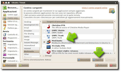 Ora basta avviare l’applicazione andare su Applicazioni -> Centro Sorgenti e cliccare su Sblocca e selezionare (come da foto) Medibuntu e cliccare su Aggiorna.