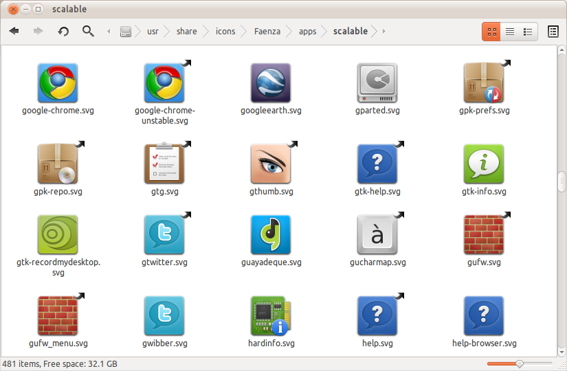 Il set di icone Faenza fornisce icone monocromatiche per i pannelli, le barre degli strumenti e pulsanti, invece icone colorate per i dispositivi, applicazioni, cartelle, file e voci del menu di Gnome.