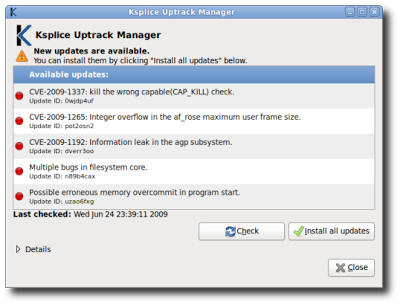 Ksplice Uptrack è una semplice applicazione che consente di applicare patch di sicurezza al kernel senza richiedere un riavvio del sistema. In pratica Ksplice modifica a caldo il codice macchina del kernel già caricato in memoria che diventa così subito operativo. Inoltre non richiede un kernel preparato ad hoc ma funziona su tutta la serie 2.6 ed è stato provato con successo nelle release degli ultimi tre anni, e con varie distribuzioni, incluse RedHat Enterprise, Ubuntu e Debian. Ksplice può applicare cambiamenti in quasi tutto il kernel, comprese le parti compilate da codice assembly e i moduli. Inoltre gestisce le patch così come arrivano dal repository GIT, senza alcun pre-trattamento. Le uniche zone off-limits per ora restano quelle riguardanti modifiche semantiche alle strutture dati: anche escludendo questo tipo di aggiornamenti, Ksplice riesce a gestire più dell’80% delle patch rilasciate.