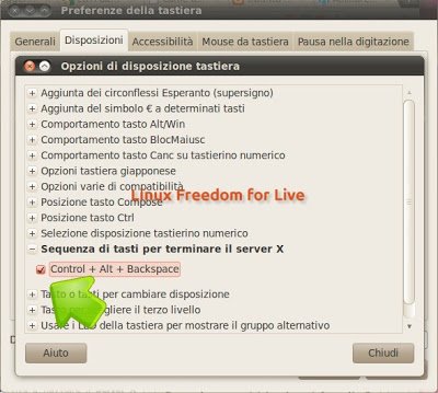Sistema -> Preferenze -> Tastiera portiamoci al tab Disposizioni -> Opzioni Ora andiamo su Sequenza di tasti per terminare il server X e mettiamo la spunta su Control + Alt + Backspace.