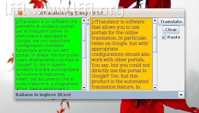 Dallo screenshot sopra si può vedere come è tutto molto semplice. La check box “Paste” è quella che abilita la copia automatica del testo tradotto nella clipboard di sistema, ma solo se il programma è attivo e non ridotto ad icona. La lingua del testo da tradurre e del testo tradotto si seleziona attraverso la combo box, le combinazioni sono quelle permesse dal portale utilizzato e se ne dovessero implementare delle nuove è possibile aggiungerle nel file “JcTranslator.props“.