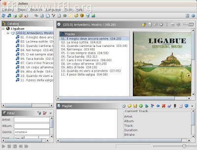Jukes è un completo player audio, scritto in Java, con il quale potremo gestire, organizzare e riprodurre al meglio i nostri file audio. Jukes supporta i file MP3, OGG Vorbis, FLAC, Monkey Audio APE, e SPEEX, ed una volta aggiunti i propri file alla libreria permette di creare un vero e proprio database musicale. Tra le funzionalità relative alla catalogazione degli album e dei brani troviamo diversi strumenti per l’ordinamento secondo differenti parametri (artisti, anno, durata, nome e così via), così come una serie di filtri per cercare più rapidamente i brani desiderati.