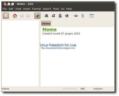 Zim, è un’applicazione. specifica per Gnome, porta il concetto di un wiki per il desktop. con il quale potremo memorizzare informazioni, link e modificare le pagine grazie ad un semplice editor WYSIWYG. Le pagine sono memorizzate in una struttura di cartelle, come in un Outliner, inoltre possiamo aggiungere anche allegati Zim gestisce diversi tipi di markup, come intestazioni, elenchi puntati e, naturalmente, grassetto, il corsivo e sottolineato