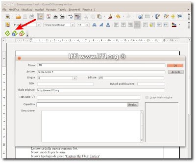 Per convertire un documento, è sufficiente aprirlo e cliccare sulla prima icona. Viene visualizzata la finestra dove potremo inserire i metadati e anche aggiungere un immagine come copertina (se il documento non ce l’ha), ma possiamo lasciare tutto come è. Dando OK avremo il nostro documento convertito..
