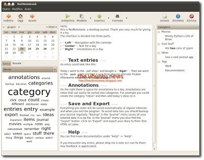 Nuovo, e importante, aggiornamento a RedNotebook, un’applicazione specifica per redigere diari e organizzare i nostri impegni o le nostre note. L’applicazione comprende un calendario di navigazione, i modelli personalizzabili per ogni giorno, la funzionalità di esportazione e la funzione avvisi a fumetto. Inoltre permette la possibilità di inserire file, immagini e collegamenti di suddividere le note in categorie assegnando loro anche dei tag.