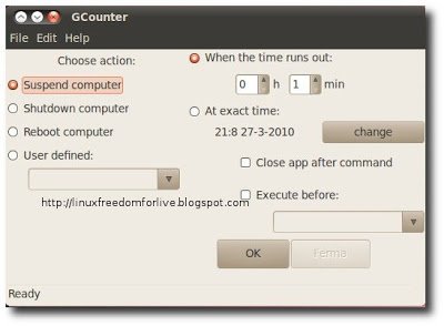 Una volta avviato GCounter (Applicazioni -> Accessori -> GCounter) possiamo impostare il tempo da effettuare il riavvio/spegnimento/sospensione o a una determinata ora oppure, in alternativa, specificare tra quando procedere all’operazione esempio stiamo eseguendo l’aggiornamento o scaricando un file il quale processo finirà tra un’ora posso impostare lo spegnimento tra un’ora e 15 minuti e lasciare il mio pc incustodito. Allo scadere del tempo prefissato il nostro computer si spegnerà. Inoltre possiamo utilizzare l’applicazione anche per avviare un’applicazione o comando ad una determinata, da notare inoltre che essendo in python la possiamo utilizzare su qualsiasi ambiente desktop.