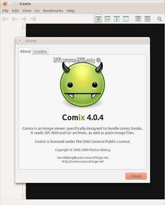 Comix è un semplice programma per visualizzare fumetti nella nostra Distribizione. Legge archivi zip, rar, tar, tar.gz e tar.bz2 (spesso chiamati .cbz, .cbr e .cbt) così come file immagine normali. È scritto in Python e ha una semplice interfaccia utente che usa PyGTK.