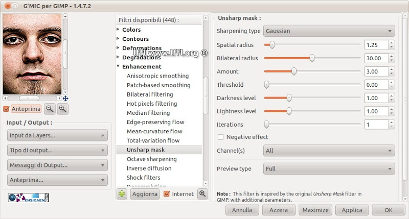 L’utilizzo è semplicissimo installiamo il plugin, avviamo Gimp, File -> Apri e selezioniamo l’immagine da applicare i filtri. Andiamo in Filtri -> G’Mic (l’ultimo in basso) si aprirà una finestra dove in alto a sinistra avremo l’anteprima e al centro i filtri da applicare, una volta scelto e personalizzato clicchiamo su Applica.