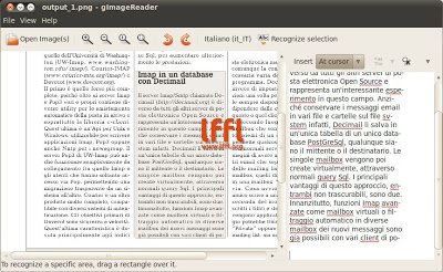 L’utilizzo è semplicissimo avviamo l’applicazione da Applicazioni > Grafica > gImageReader una volta avviata clicchiamo su “OpenImage” e selezioniamo il Documento Pdf o l’immagine da scansionare, selezioniamo delle aree particolari (in caso si voglia scansionare una parte dell’immagine o documento) e impostiamo la lingua di riconoscimento.