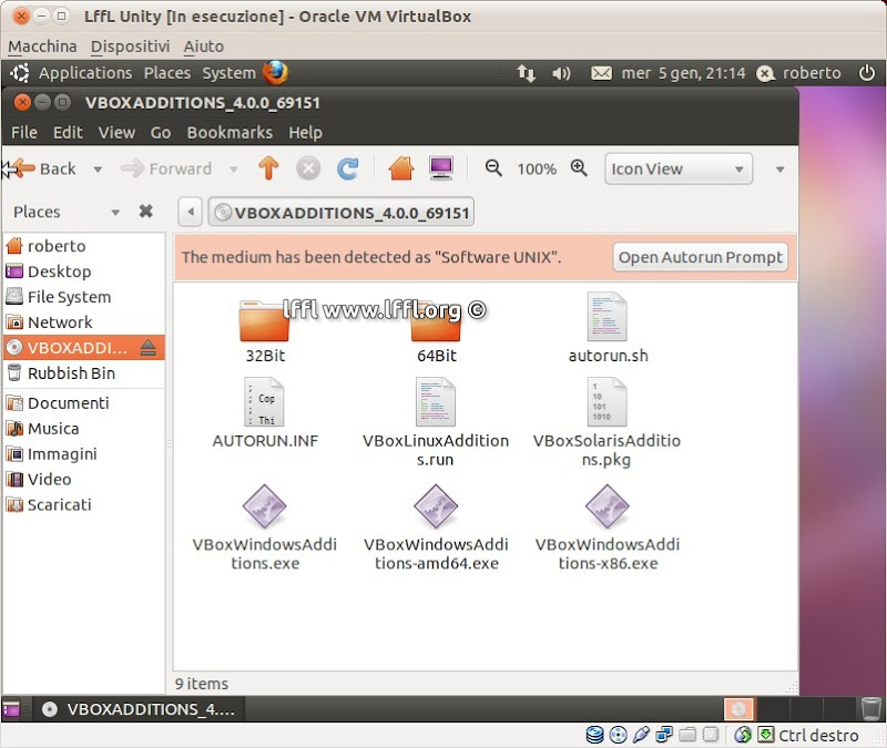 si aprirà il nostro Nautilus e vedremo sulla sinistra VBOXADDITIONS clicchiamoci sopra, appariranno diversi file (vedi immagine sotto) noi dobbiamo dare un doppio click su VBoxLinuxAdditions.run, alla richiesta clicchiamo su Run in Terminal o Esegui nel terminale, partirà un’installazione al termine riavviamo il nostro Ubuntu 11.04 Natty.
